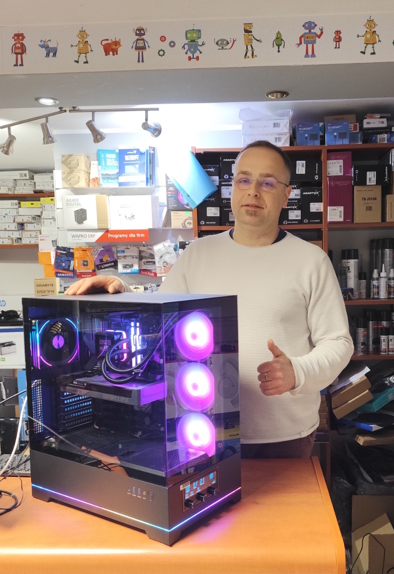 Proces składania komputera, rozpoczynam od zebrania informacji, do jakich zastosowań komputer będzie używany, jaki przedział cenowy i jakie opcje wizualne są preferowane. Następnie klient otrzymuje oferty z kilkoma konfiguracjami. Po wybraniu określonej opcji i wpłaceniu zaliczki następuję praca przy montażu, która zajmuje do 3 dni roboczych.